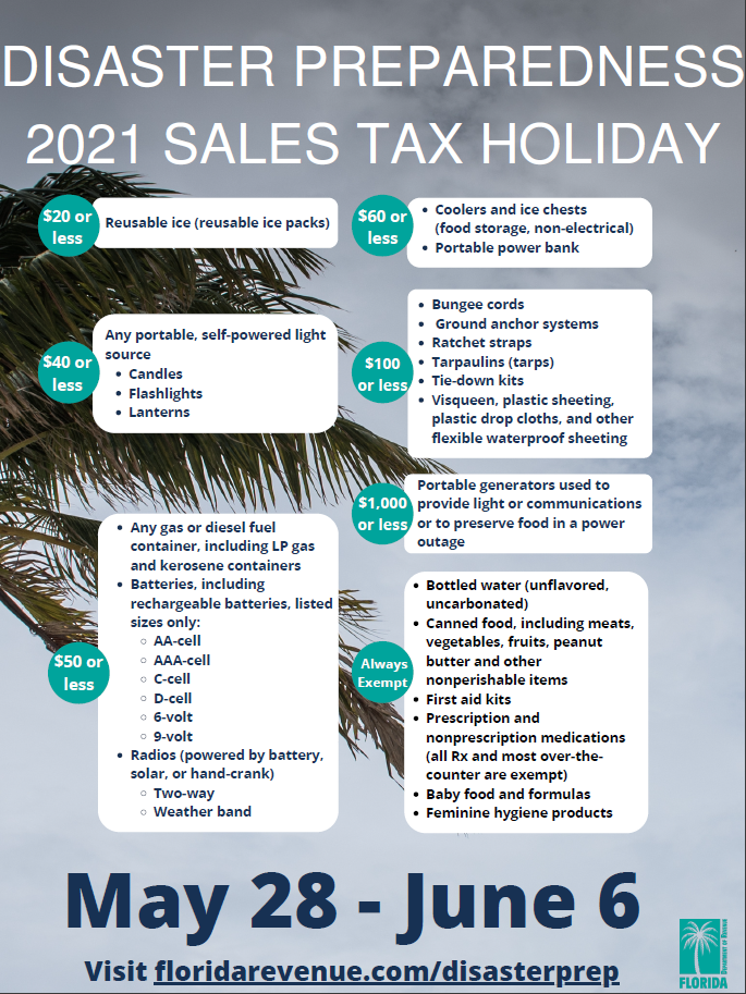 Now is the time to prepare for the 2021 hurricane season. Florida consumers can purchase qualifying disaster preparedness supplies exempt from tax during the 2021 Disaster Preparedness Sales Tax Holiday.