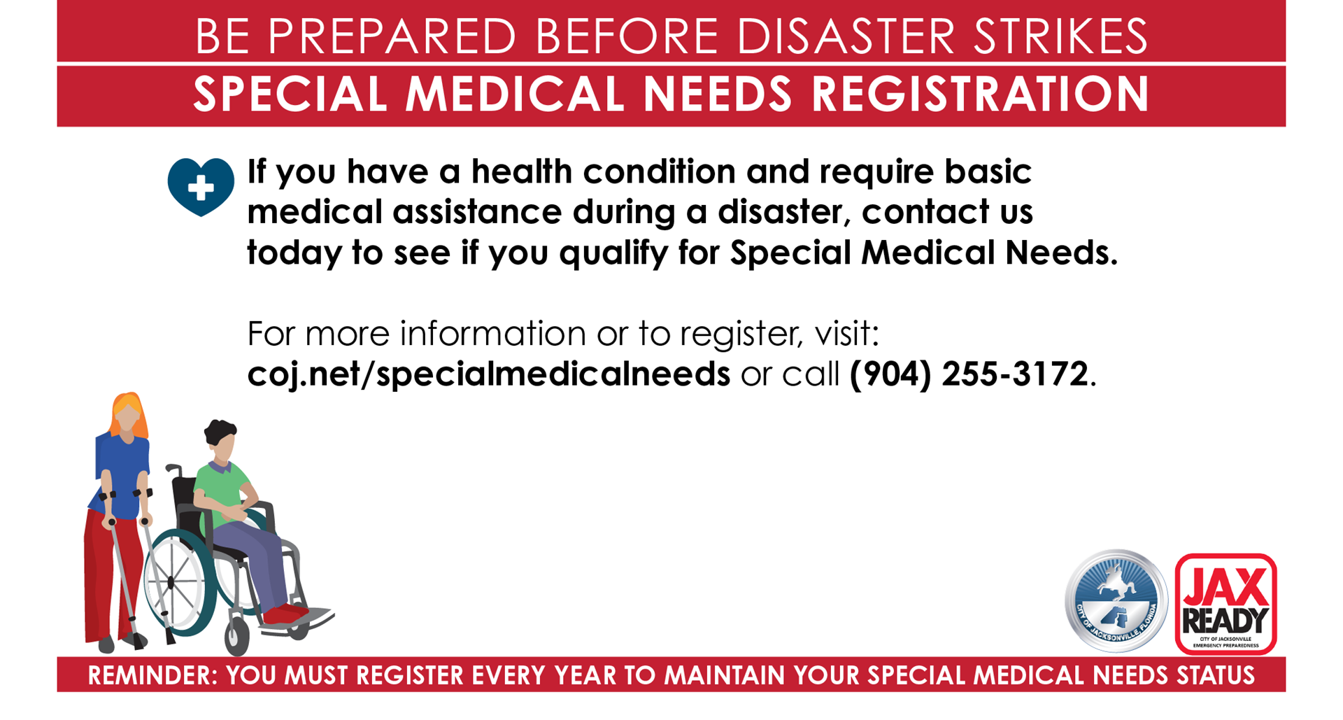 If you or someone you care for is a Duval County resident that is medically dependent on electricity, oxygen, or may require basic assistance from medical professionals during a disaster, we encourage you to submit an application for Special Medical Needs status today.